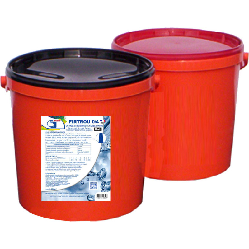 Enrobé à froid à base d’émulsion de bitume pour surfaces en bitume et en béton prêt à poser. Longue conservation. Utilisations : nids de poule, trous, tranchées, remise en état de la voirie. Séchage rapide, mise en circulation possible dès la fin de la réparation. Mise en oeuvre : enlever les parties friables du nid de poule à reboucher. Verser le produit dans le trou en débordant d’un centimètre. Egaliser avec une pelle ou un râteau. Compacter à l’aide d’un rouleau, d’une plaque vibrante ou d’une dame. Peut s’appliquer sur surfaces humides. Consommation: 20 kg/m² sur 1 cm d’épaisseur. Grade bitume : 70/100.